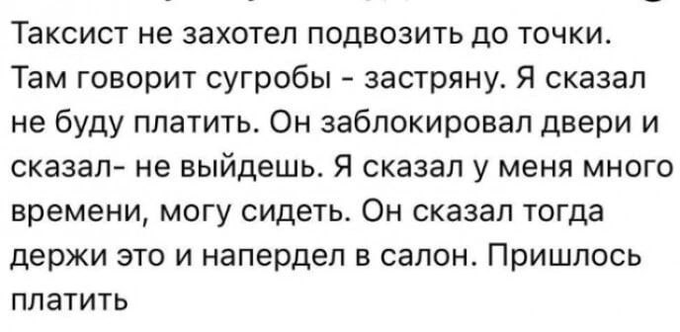 Когда едешь допустим в комфорт плюс и водитель перданул но не подал виду: задумайтесь!!! Комфорт плюс пердёж!!! Люди!!! Вас обманывают!